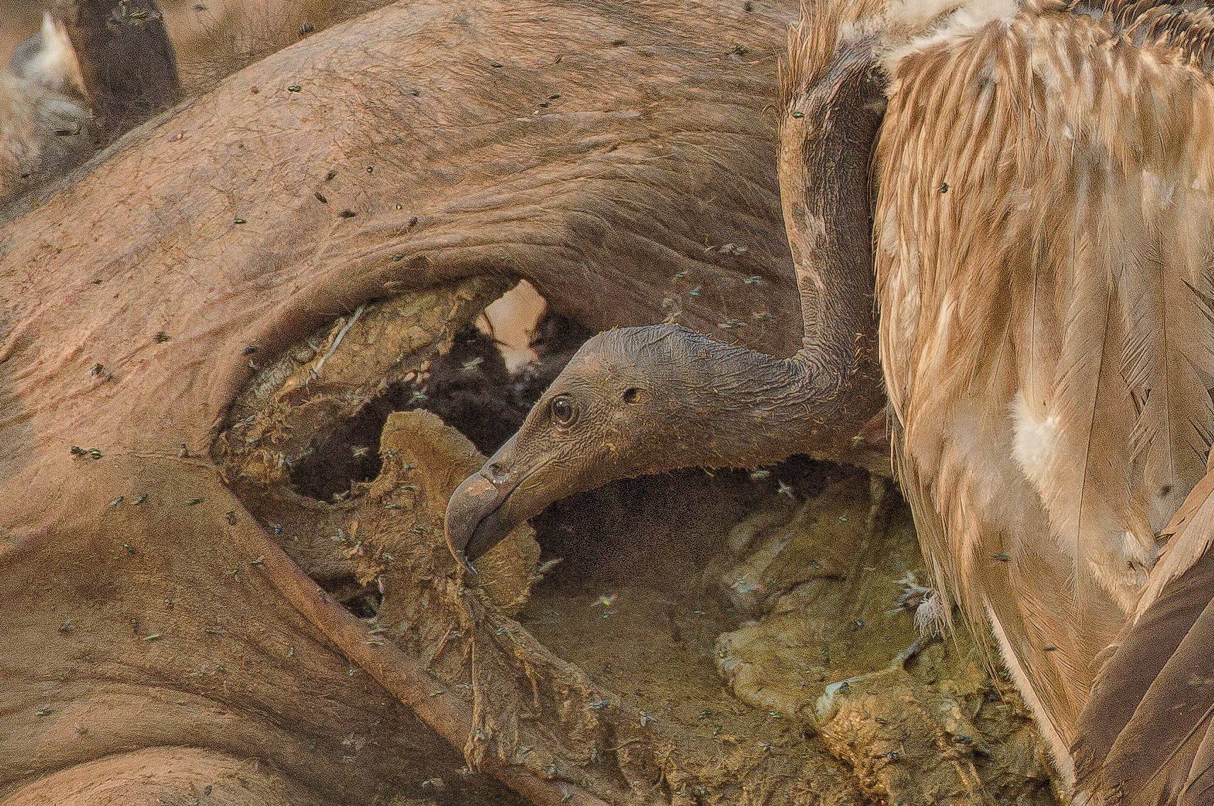 "Traumatic Birth" Emerging from inside of the carcass a juvenile white-rumped vulture (Gyps bengalensis) is immediately assaulted by another white-rumped while a slender-billed (Gyps tenuirostris) looks on, Western Siem Pang, Cambodia, 2014